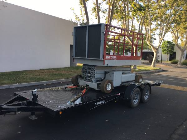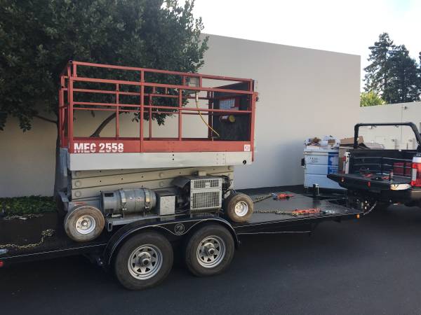 Available is a 1997 MEC 2558 Dual Fuel outdoor scissor-lift. By Mayville Engineering Co.. Inc.