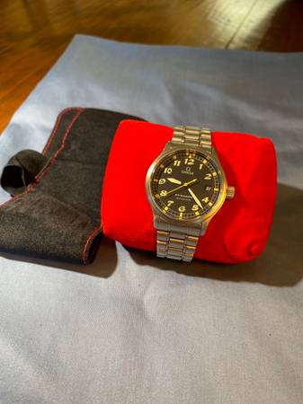 Omega Dynamic watch Swiss Made. Movement is automatic self winding or manual wind, caliber 1108, water resistance to 50 meters frequency 28800. Case is stainless steel with screw down crown with Omega logo and solid screw down back. Case width is 37mm x 9.5mm thick. Scratch resistant sapphire crystal (perfect condition). Bezel is smooth stainless steel. Dial is black with white Arabic numerals with luminescence on Arabic’s, markers, hour and minute hands. Markers and seconds hand are yellow. Functions are hour, minute, seconds and date at 3 o’clock. Bracelet is stainless steel and Original leather Omega strap in chocolate brown. Watch comes with original outer box, inner container, operating manual, service booklet, warranty card (expired) and watch holder.