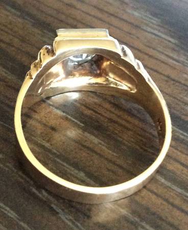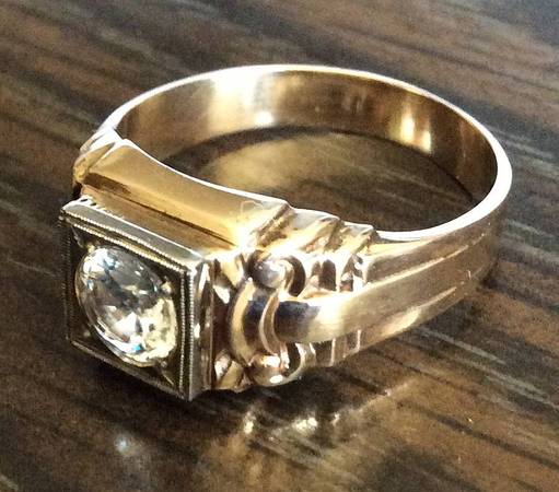 10K solid gold simulated diamond solitaire Two-tone vintage ring: white and yellow gold, as shown Approximate size: 9 1/2 Approximate measurements: front center: 7mm square; back (underneath) of...