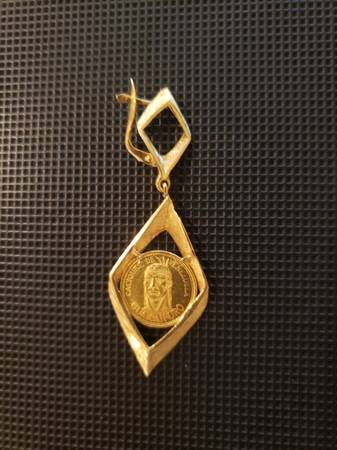 Beautiful vintage, pristine condition, approximately 60 years old, uncirculated Venezuela 5 Bolivares 1.6 grams gold coin.900 (21.6 pure gold) caciques, Indian chief, in an 18K florentine finish earring,,pendant or brooch/pin setting, weighing 4.98 grams, measurements are: 2 inches long and 3/4 inch wide for pendant, coin 9/16 across, this is a unique beautiful piece of jewelry purchased by my parents while they visited South America in the 60's, never worn, pickup in Danville, no shipping, cash only.