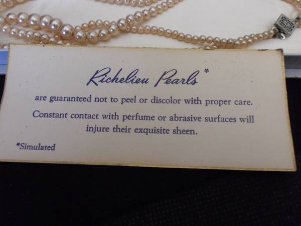 Beautifull simulated, vintage double strand pearl necklace in original box. This necklace has never been worn and the pearls have a beautifull sheen. They are guaranteed not to peel or discolor. Measures 16".
