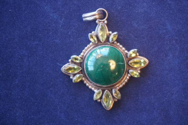 This beautifully crafted jewelry is silver-toned setting and has a giant jade colored stone, with many light green gems surrounding.