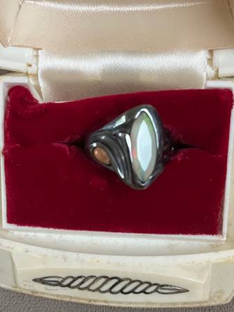 Just purchased but too large for me. Unusual silver with opals. Antique finish for unique look and no tarnish! Both opals have plenty of fire. Smaller opal is South African. Large one is from Mexico, beveled for even more elegance. One of a kind! I paid $200. Will consider best offer.