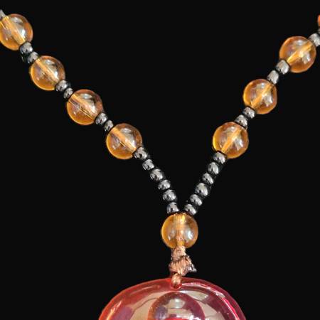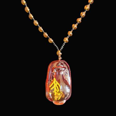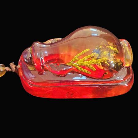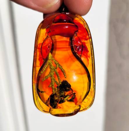 This necklace is a bit weird! It has an Amber-like resin centerpiece shaped like an urn on a base and within that and completely encased is a little piece of plant and… a fly! It's a one-of-a-kind style necklace with black and amber glass beads. Great gift! It measures 25” around.