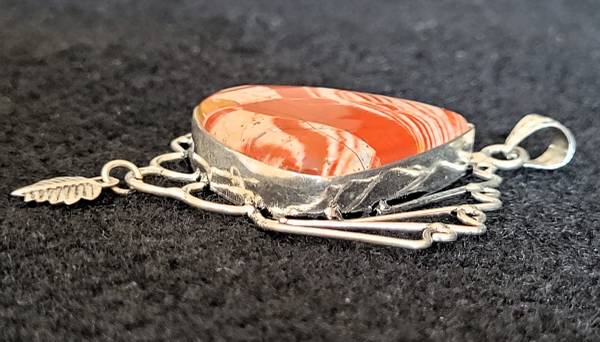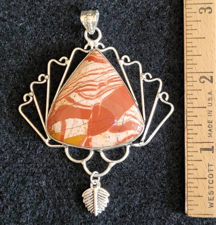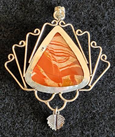 This is a one of a kind large Triangular Convoluted Red Jasper Stone that’s more of a Burnt Orange color woven in cream.The setting is of Sterling Silver with filigree wiring on the sides and a leaf that dangles on the bottom. Marked 925 on the back. Add it to a silver chain, ribbon or cord as a necklace. A wonderful gift for yourself or another! Pendant measures 2.25” wide at the widest point and 3” long with bail. It is new, never been worn.