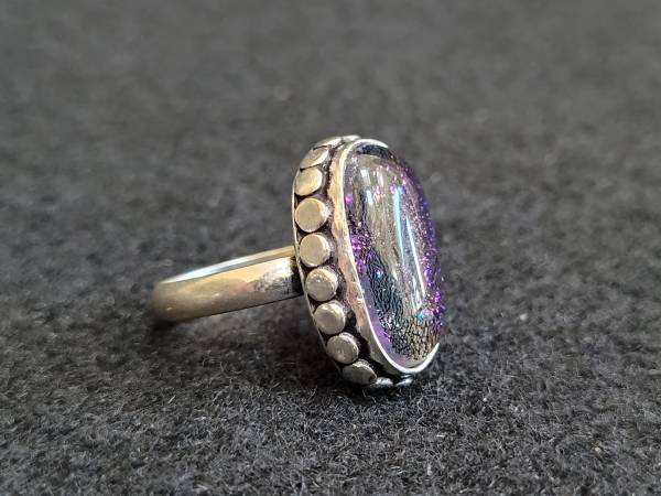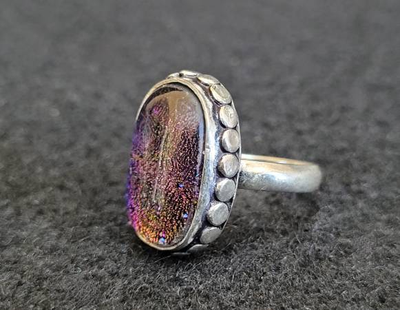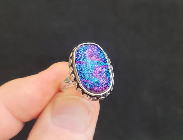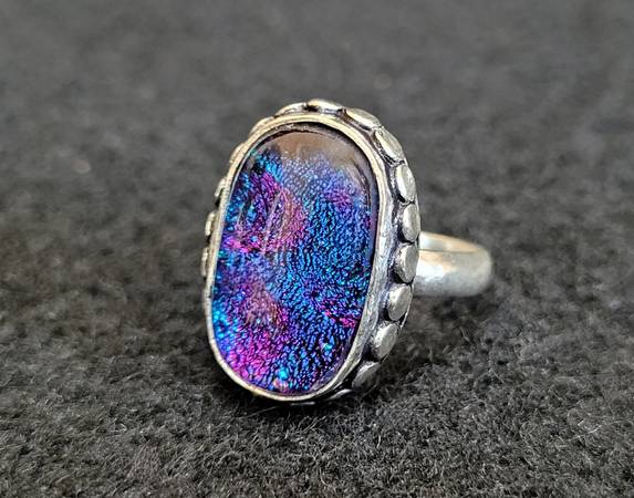 This Modern Duochrome Art Ring sparkles with a stone in Pink and Blue in a setting of Silver (marked 925), very unique and original! The color changes dramatically from pink to blue shades as you look at the stone from different angles, as seen in the photos. This unisex ring is size 7 and is new, never been worn. The style is a bit rustic and stones in our jewelry are real but of a lesser quality or lab grown as reflected in price, but are just beautiful! This piece is in new condition and has never been worn. Great gift!