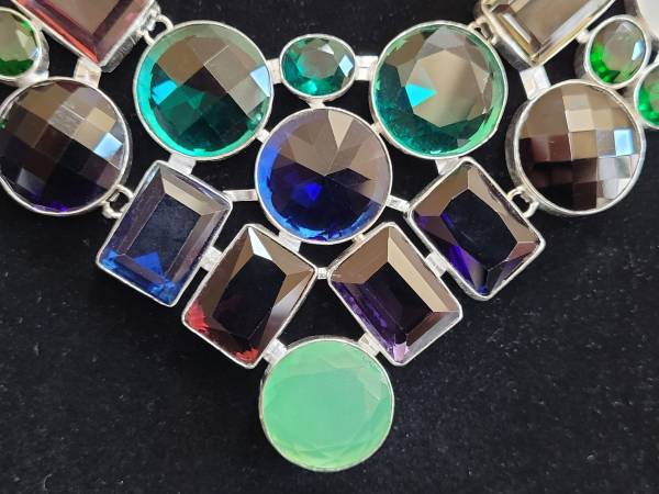 These stunning Gemstones sparkle in this silver Necklace, at least 6 types! Its a one-of-a-kind bib collar style. It has a multi-ring closure to adjust the length of the necklace to any outfit.
