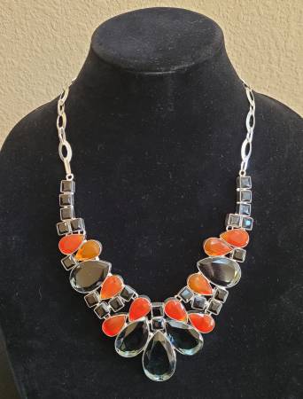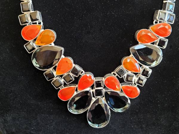 This stunning Orange Carnelian and Denim Blue Sapphire Gemstone Necklace has a setting of silver in this one-of-a-kind style bib collar necklace. It has a multi-ring closure to adjust the length of the necklace to any outfit.