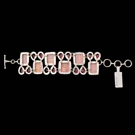 Stunning stones of Pink Rhodochrosite, Rubellite and Quartz are in a setting of silver, marked 925, in this one-of-a-kind stylish Bracelet. It makes a beautiful statement!