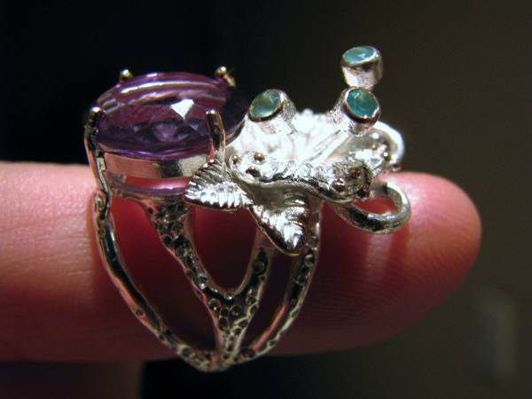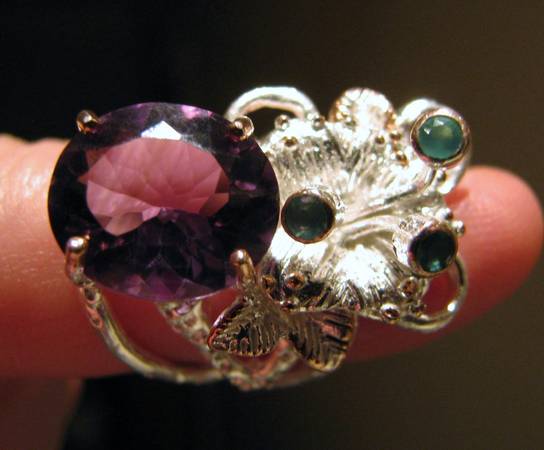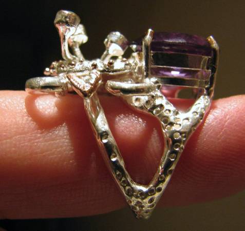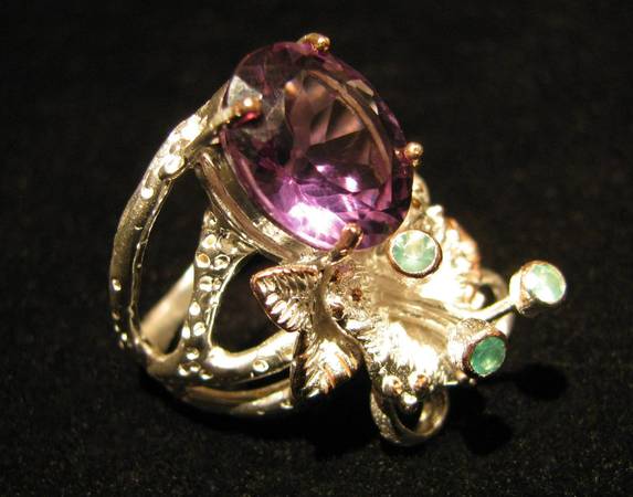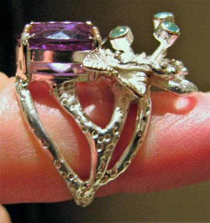 This Unusual Silver Cocktail Ring (marked 925) has a large sparkly Purple Amethyst Rhinestone next to a Silvertone Flower edged in Rose Gold that has small emerald colored stones in the stamens with swirls and leaves behind. The band has a design of forking branches. Very pretty and unique, it measures over 1” across the top, and has never been worn. Size is 7.25. Weight is 4 oz.or 12 gms.