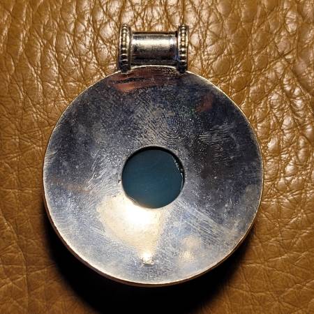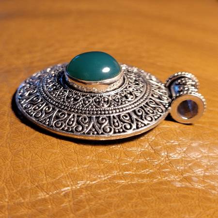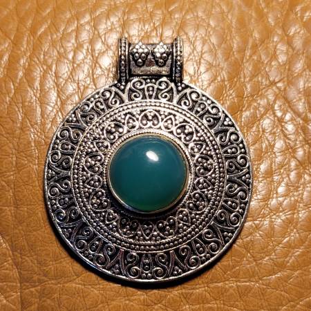 This handsome round Pendant is Silver, marked 925 on the back, in a wonderfully intricate setting. It has a Green Agate set in the center. Unisex, wear it on a silver chain, cord or ribbon as a necklace. It's new, and has never been worn. A wonderful gift for yourself or another!