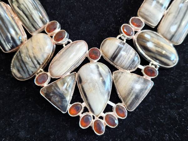 This handsome Zebra Stone and Garnet Necklace is amazing in a setting of silver in this one-of-a-kind bib collar necklace. The necklace has a multi-ring closure to adjust the length of the necklace to any outfit.