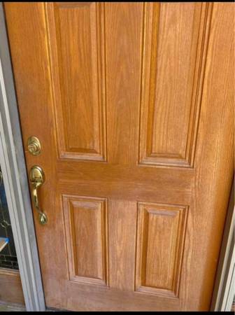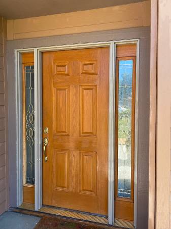 Your new righthand (RH in-swing) front door is here! Gently used door and brand new door frame w/ aluminum metal sill plate only.