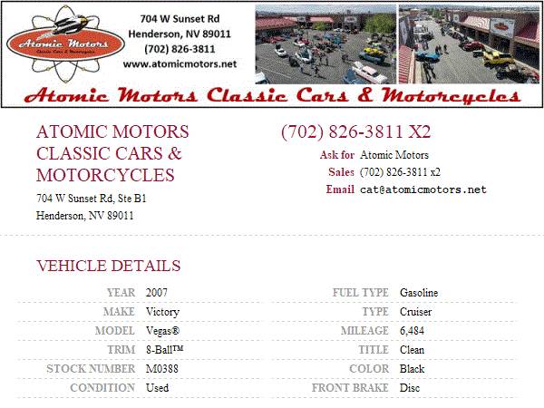 This vehicle is located at Atomic Motors Classic Cars & Motorcycles in Henderson, NV just 20 mins from the fabulous Las Vegas Strip. Come down and see us at 702-826-3811 ext 2. Additional pictures and videos may be found on our site at www.atomicmotors.net