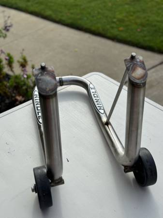 I have two Hindle fork stands for sale. One is 7.5” wide and the other is 8.25”. Your fork will need to have a hole underneath so the pin can grab onto it. $35ea.