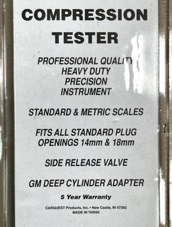 Heavy duty, fits all standard car and motorcycle plug openings. Operating manual included. Gauge reads in both Standard and Metric scales. Deep cylinder adapter included. Brand new!