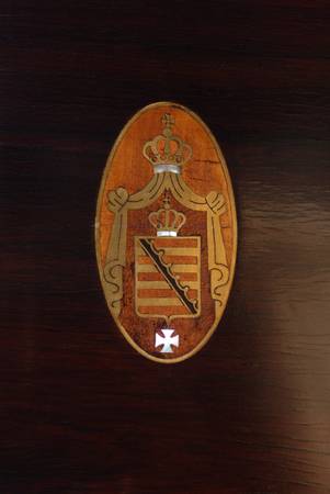 Beautiful wood inlay in the emblem on top panel, which includes mother-of-pearl ( see close-up pic ).