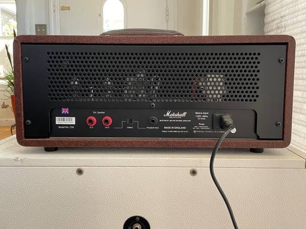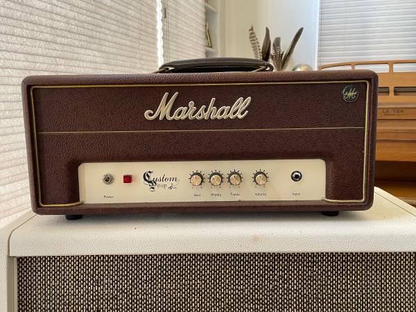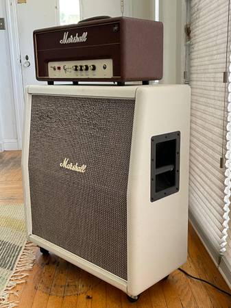 Good used condition Marshall custom pin up 5 watt amplifier. Made in England. 8 ohm and 16 ohm output options as well as headphone output. Volume, bass , middle, treble controls. Sourmash replica 2061 CX Marshall 2x12 slant front cabinet with white tolex loaded with 2 celestion greenbacks. 8 ohm input, 50 W output. On casters. Too loud for my needs.