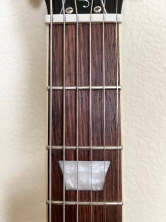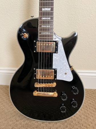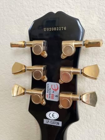 Gorgeous Ebony Epiphone Les Paul Custom Electric Guitar made in Korea in 2002, a very desirable year and country of manufacture. Pretty much like new, no dings or marks, just some aging of the gold hardware. Rosewood fretboard, all-mahogany body, slim Taper D neck for fast playing, Famous "Tuxedo" version of the Les Paul with diamond shaped headstock MOP inlay. Has new Ernie Ball strings, and set up for low action and correct intonation. Added a pearl pickguard for extra "pop". Includes an Epiphone hard case which I believe came with the guitar back in 2002.