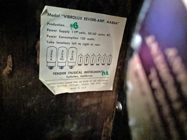 I am the original owner of this like new amplifier. I bought it at Guitar Showcase when the store was in the owner's house. It has spent most of its life in a closet in my non-smoking home. An expert technician noted that it was built around the end of 1965. I was told that the serial number places it as January 1966. I am selling it so someone can take advantage of having this excellent tone machine. I have a smaller amplifier that I use for local gigs. Everything is original (including the grille cloth, tolex, footswitch and 2 prong cord) except the five B+ electrolitic filter capacitors that I had expertly replaced a number of years ago and one control knob. There is a typo on the tech's evaluation. The speakers are 10" original Jensens with code 023036 C8284 2. I received the following message via Reverb that "The C10NS was only available in Fender amps in 65 and 66, mostly Vibrolux Reverb and in 66 it was available in the Princeton and Princeton Reverb. However, the part # on the Jensens were different, C8284 on the VLR and C8306 on the Princeton. You got the C8284 number on your Vibrolux, it's also the big magnet of C10N and the correct sticker, so it's the C10N for sure." For another Reverb customer I pulled one of the tubes to confirm it was made by RCA.