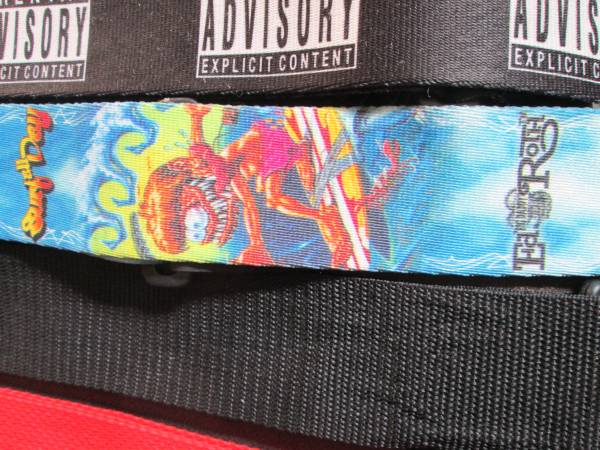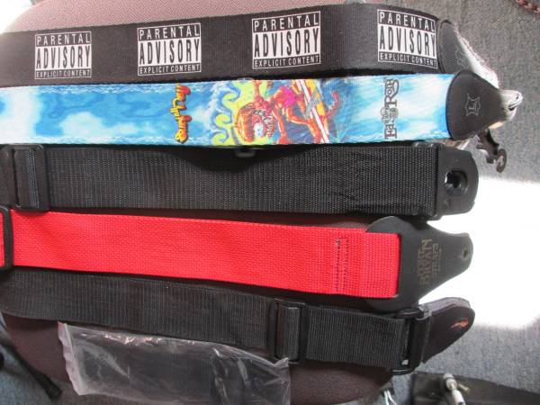 Guitar or bass straps. Black strap $5; a new Levy's - black strap (Parental Advisory Explicit Content) $15, new Levy's Limited Edition Ed Roth Surf All Day $30; vintage Fort Bryan Straps - red strap $10; black strap with built-in locks $15. Item will be deleted from ad when sold. Include your phone number for a reply. I will call or text you. Thanks and stay well.