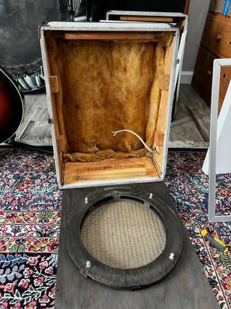 This is a cool old stereo speaker cabinet that hooks together into a suitcase like thing and is super portable. Two 1x12" cabs. Has 1/4" jacks, would make an awesome portable stereo guitar cab setup!