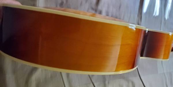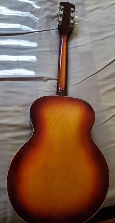 Harmony Broadway H-954 Sun Burst ArchTop Acoustic Guitar. The Broadway model H954 was made with Highly polished birch wood top and sides, maple neck. Birch is a great Tonewood, not quite as brilliant as spruce, but with much more midrange and a solid bottom. Rosewood 19 fret fretboard, Rosewood adjustable bridge. Edges are bound, top edge inlaid with distinctive black and white block design. Trapeze tailpiece. The instrument is all original and in excellent condition, except a small crack on the top inner edge of the pickguard where it appears the screw was over tightened. See pic. Gorgeous guitar, original case.