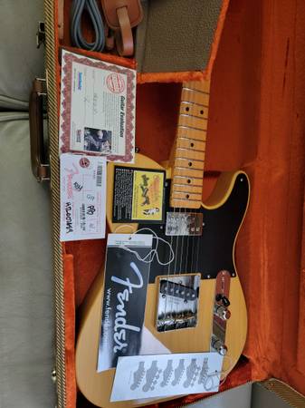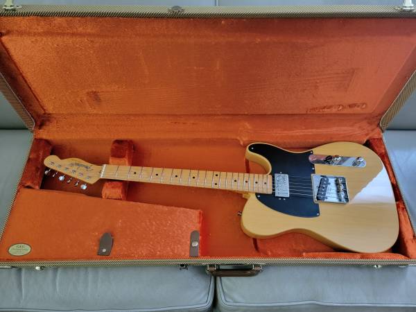 Fender American Vintage 50’s Hot Rod Telecaster from 2014 in excellent condition with maple fretboard in classic butterscotch blonde with single ply bakelite pickguard. This year’s hot rod series has nitrocellulose lacquer finishes and a 7.25”- 12” compound radius necks, features generally found together only on custom shop guitars.