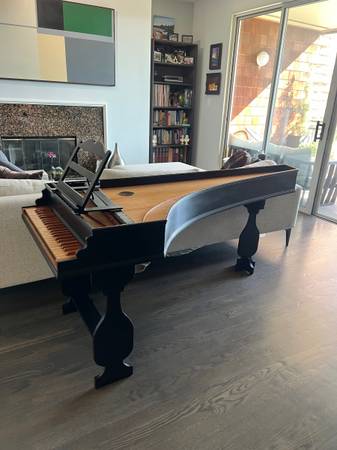This harpsichord holds its tuning well, and has the traditional 2x8’ disposition, Zuckermann plastic jacks and celcon plectra, with stop levers in the keywell. Currently at a=440, it can be tuned at either 440 or 415. Included with the instrument is the stand it rests on, music rack, tuning hammer, and one tuning/regulation/maintenance lesson for the buyer.