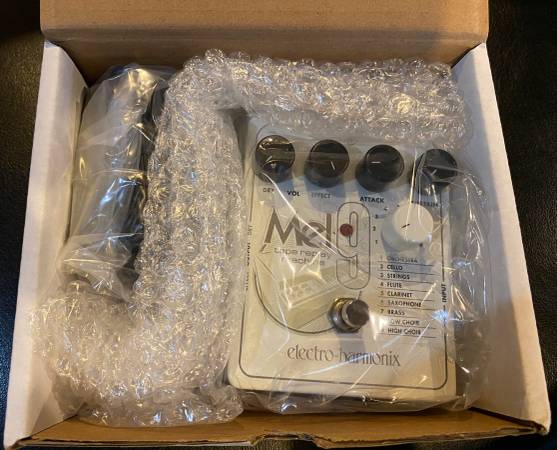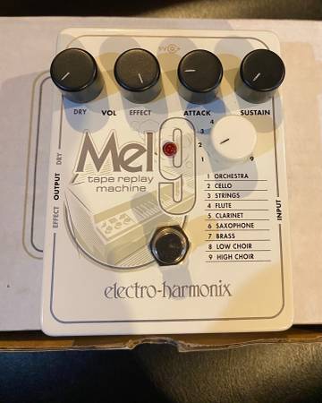 Now any electric guitar player can have access to nine magically quirky, dark and unique Mellotron® sounds. No more extra devices such as special and cumbersome 13-pin MIDI pickups! In addition to electric guitar, you can trigger the MEL9 with any instrument that produces an electrical output, such as a keyboard or a bass, down to 55 Hz or A1. The polyphonic EHX MEL9 has superior tracking; you can create single notes or chords with ease. The MEL9 will follow guitar bends, dive bombs, slurs, and any other guitar expression/performance techniques you can throw at it! Pays homage to nine of the coolest Mellotron® sounds: Orchestra, Cello, Strings, Flute, Clarinet, Saxophone, Brass, Low Choir and High Choir Works on guitar without modifications, special pickups or MIDI implementation and tracks bends, slides, even whammy dive bombs! Also works with bass guitar down to the open A string as well as keyboards within the limits of its polyphony (5 notes) and range (A1 to A5) Includes independent Effect and Dry volume controls so you can create the perfect mix at the Effects output Dry Output jack outputs your input signal at unity gain Attack control sets the volume swell speed. As it’s turned clockwise the notes fade in more gradually Sustain control adjusts the release time after a sound is stopped. As it’s turned clockwise, the fade out time increase Power adapter included