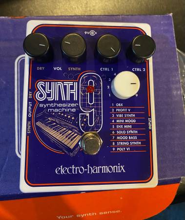 The polyphonic EHX SYNTH9 Synthesizer Machine transforms your guitar or bass with 9 presets that were precisely tuned to emulate the most sought after, vintage synthesizer sounds ever! From searing lead synths to spacey synth pads and deep, funky, synth bass grooves, it’s all accessible. The SYNTH9 is also super easy to use with DRY volume, SYNTH volume, CTRL1 and CTRL2 knobs that provide precise control over each preset’s parameters. If you dig the kind of classic synth sounds made famous on recordings by groups like ELP, EVH, Kraftwerk, Joy Division, P-Funk, Peter Gabriel and more, we think you’ll love the SYNTH9. Transforms the tone of your guitar or bass into that of a vintage synthesizer 9 presets that were created to emulate many of the most popular synthesizer sounds ever Works on guitar or bass without modifications, special pickups or MIDI implementation The SYNTH9’s usable tracking range extends up to about the 23rd fret on the high-E string of a standard guitar and down to the open A-string on a bass guitar Use the SYNTH9 with a B9 or C9 Organ Machine as well as the KEY9 Electric Piano Machine and MEL9 Tape Replay Machine to create your own mega-keyboard setup Power adapter included