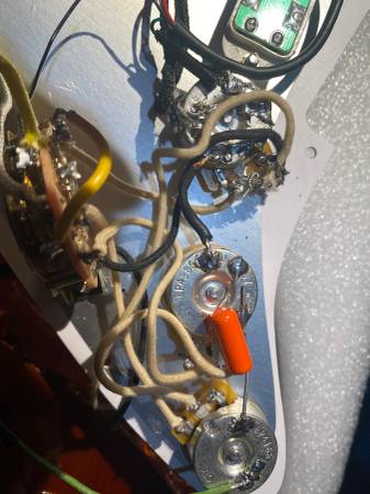 Full size trem block; Upgraded Fender bridge; Shielded cavity; CTS pots and Orange Drop cap.