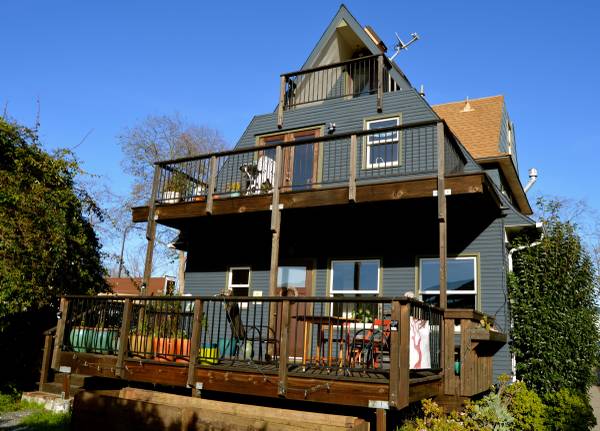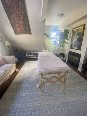 Upstairs, there are two private treatment rooms (266 sq ft and 120 sq ft), the larger of which also is connected to a good sized loft (230 sq ft). There is also a little kitchen/waiting area, deck, herb garden, parking, etc. Each of the private rooms has a couple of comfortable chairs and a massage table. The larger room upstairs also has a couch.