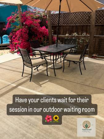 ๐ธ Flower-filled patio โ ideal for outdoor meals or as a calming client waiting area