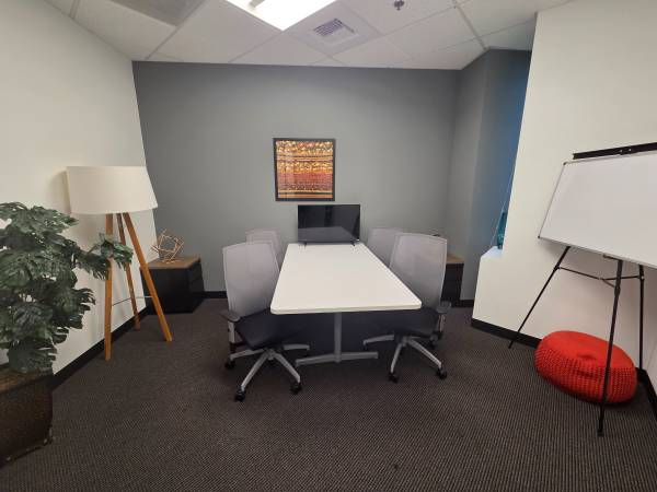 This windowed private office offers room for up to four workstations in a fully serviced, move-in-ready setting.