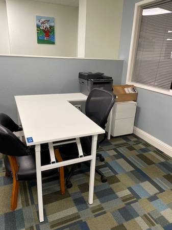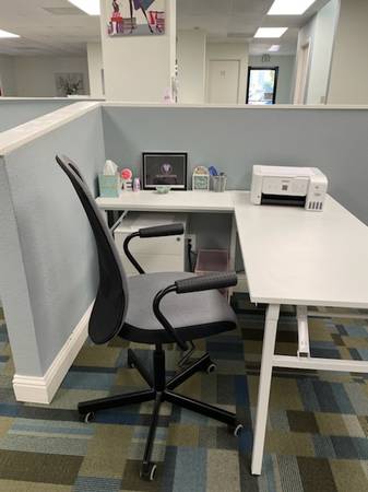 We have a few more "L" Shaped desks, filing cabinets with a lock available. Each desk/cabinet is $345 a month.