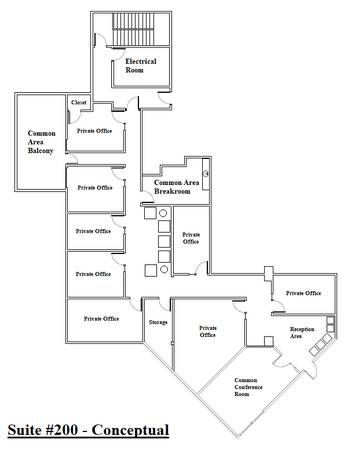 Suites #200 - an office space totaling 3,500sf with a private balcony. Floorplan is flexible and the space is potentially divisible to 1,500sf.
