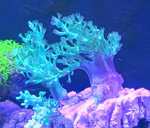 Tree / Leather Corals. There are about 2 corals on first 3 inch rock. There are about 2 corals on second 3 inch rock. Corals are about 3 inches tall together they are about 3 inches wide. Tops of corals glow neon blue / green under blue actinic lights. $10 each or $15 for both.