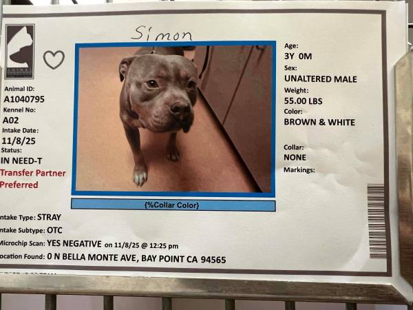 Adopt or foster Simon! He is an affectionate 3 year old American Bully with a sweet personality and an amazing smile. With his soulful eyes and adorable face, Simon is sure to capture hearts. He is a gorgeous brown tricolor boy of medium size with white paws and chest. Simon is a happy guy who is always wagging his tail. He's fun and playful, and he gets excited to see people and dogs, and he's not afraid to show it. He knows how to sit and take treats gently, and he loves playing with toys and exploring. He is 55 pounds. Simon can get a bit vocal when he's not getting enough attention. Text me if you would like to meet him and foster or adopt him with the help of a rescue group. Located at CCAS in Martinez.