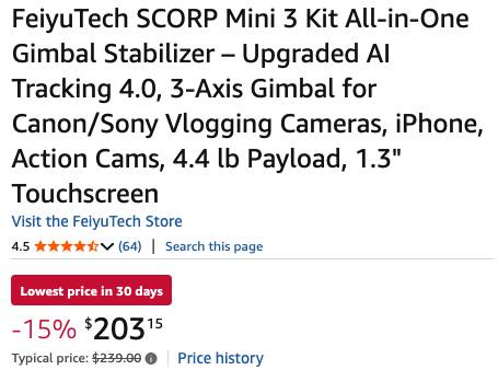 FeiyuTech SCORP Mini 3 Kit All-in-One Gimbal Stabilizer – Upgraded AI Tracking 4.0, 3-Axis Gimbal for Canon/Sony Vlogging Cameras, iPhone, Action Cams, 4.4 lb Payload, 1.3" Touchscreen