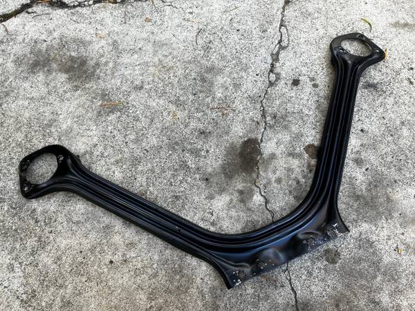 Export brace between shock towers and cowl for 1965-70 Ford Mustang. Likely a repro, not Ford original. Very stout steel, fit great, removed to return to stock arms. Unequal spacing for bolt holes on cowl. Small amount of paint damage from spilled brake fluid apparently.