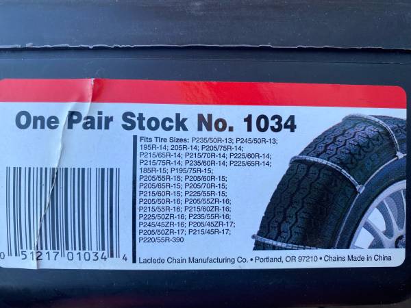 Radial Tire Chains, fits standard tires. Please see photo for tire sizes that work with these. Works great. Only used once until we changed car. Brand new $59...