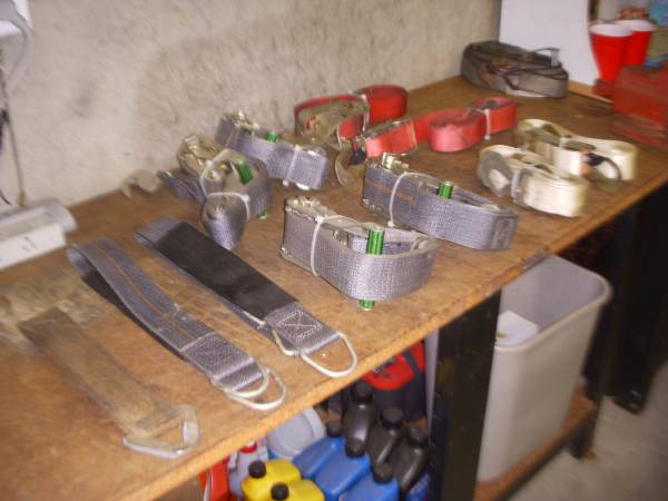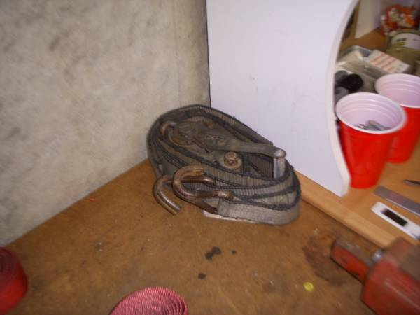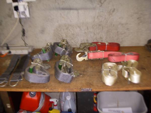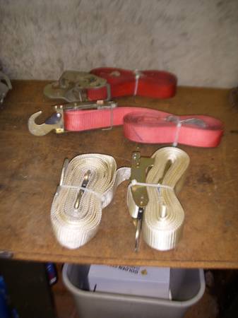 RATCHET STYLE TIE DOWNS FOR STRAPPING A CAR TO TRAILER. DIFFERENT STYLE FOR MANY USES VARIOUS LENTHS , CASH AND CARRY LOCAL PICK-UP RESPONDING BY TEXT WORKS THE BEST FOR ME.