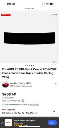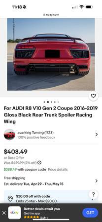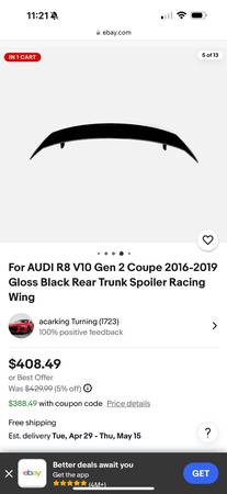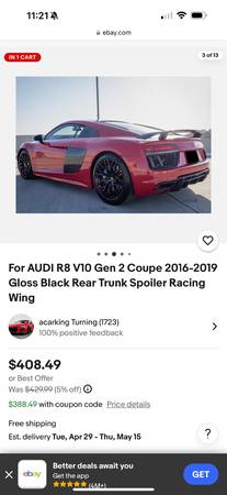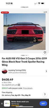 FS: New Audi R8 V10 Gen 2(2016-2019) Replica OEM Plus gloss black wing - $80 (fairfield / vacaville)