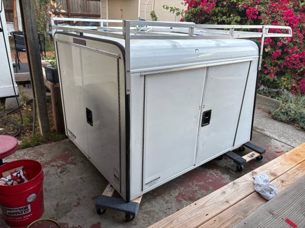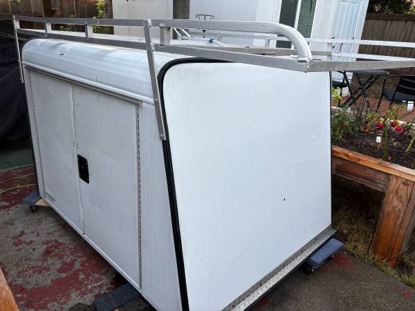 Bought this shell for a project, decided to go in a different direction. It will fit perfectly on a flatbed truck and GEM electric truck. It has 3 sets of double doors with new T-handle locks, 6 keys all new. Heat gun vinyl graphics will come off. Base is 68” long x 52” wide , Aluminum roof rack.