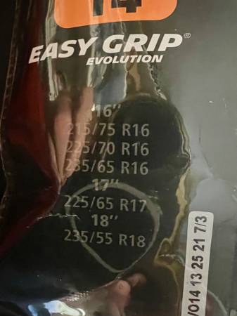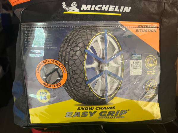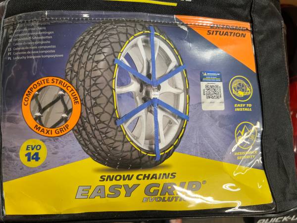 Selling a set of four Michelin "Easy Grip" snow chains, size EVO 14, ideal for all-wheel drive vehicles. These chains are designed to fit a variety of tire sizes and provide exceptional traction in snow and icy conditions. Made with a composite structure and metal loops, they are easy to install and offer superior grip without damaging your tires.