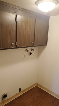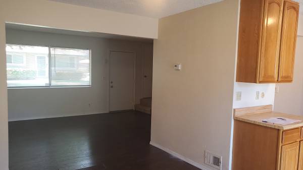 Modern living room dining room has plenty of natural light. Charming laminate flooring with kitchen tile. The half bathroom downstairs is great for entertaining and faces the laundry nook with storage.