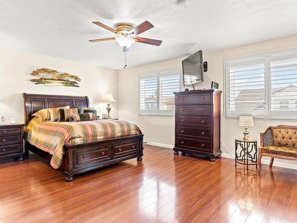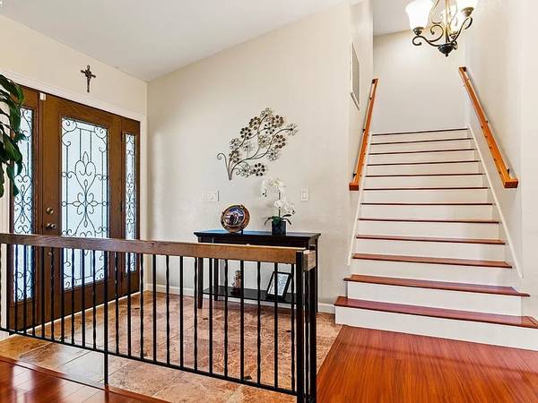 Wonderfully upgraded home in Hayward's College Park and shows very well! Shapell-built home with formal living and formal dining areas, **bedroom and full bathroom downstairs** for guests or in-laws, family room with cozy fireplace, remodeled kitchen with nook dining, quartz counter tops, stainless steel appliances, and extra long service bar. Oversized primary bedroom suite with multiple closets, primary bathroom remodeled with dual vanities and custom shower. Some of the amenities include dual zone central heat and air conditioning, new dual pane windows throughout, plantation shutters, recessed lighting throughout and raised ceilings! Unbelievable backyard with covered patio and pavers. Popular and convenient location, very close to major retail, many restaurants, Chabot College, and commuter friendly to the San Mateo Bridge!