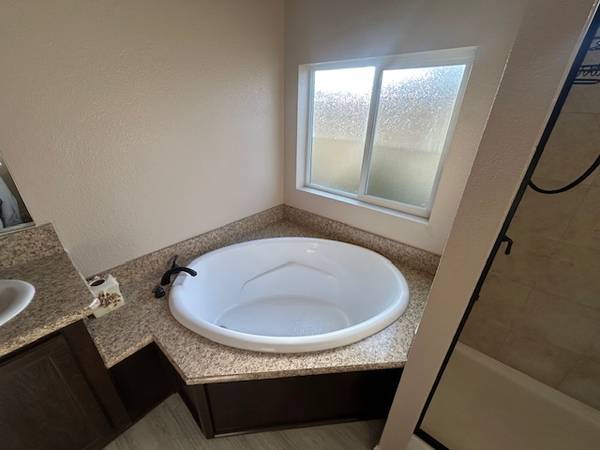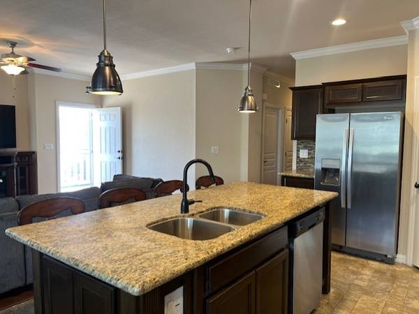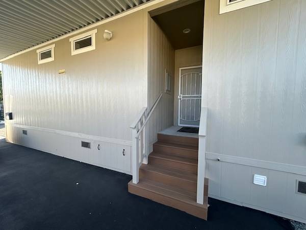 WOW! Beautiful manufactured home in Hayward Mobile (adult park). This property has: 3 bedrooms; 2 full baths; open living concept with living, dining and kitchen adjacent to one another; kitchen with granite counter tops, stainless steel appliances, gourmet island, and lots of storage including walk in pantry; primary suite with 2 closets and private bath with 2 sinks, stall shower and relaxing soaking tub; indoor laundry room with washer and dryer included; security doors at both entrances; ceiling fan in the living and primary bedroom; crown molding throughout home; great location in the heart of Hayward with low space rent.