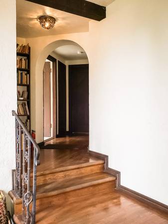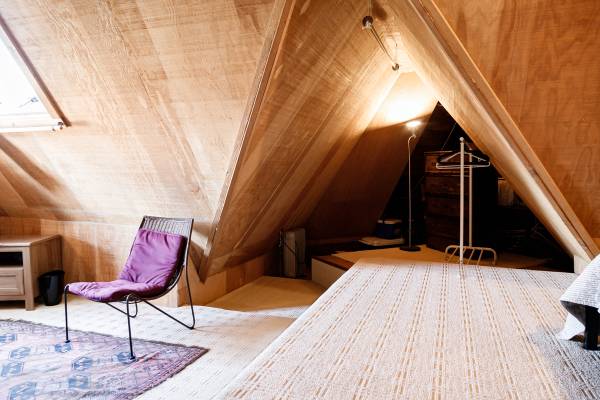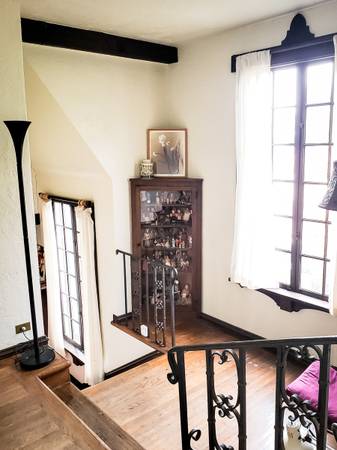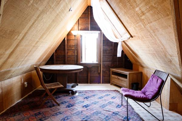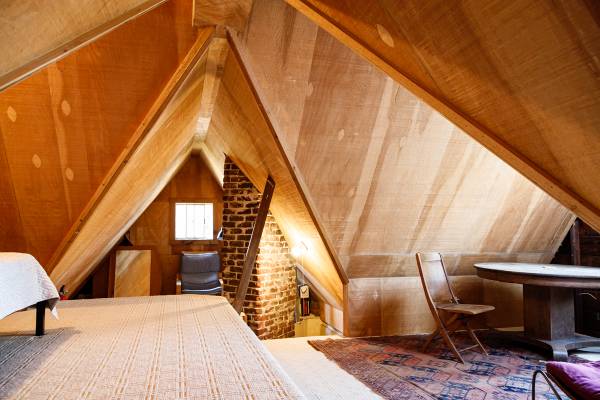 Fully furnished attic loft accessed by a short ladder. Three windows that open. Electric heat. Shared bathrooms with one other and shared kitchen. Large patio and yard with pingpong table, table, internet, barbecue.